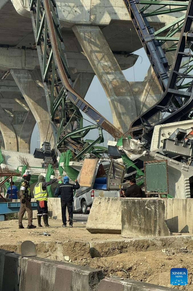 This photo taken with a mobile phone on Jan. 15, 2026 shows the accident site on Rama II Road, the key thoroughfare linking Bangkok and Samut Sakhon province, Thailand. A construction crane collapsed Thursday morning on Rama II Road, the key thoroughfare linking Bangkok and Samut Sakhon province, leaving two people dead and several others injured, according to Thai media reports. (Xinhua)