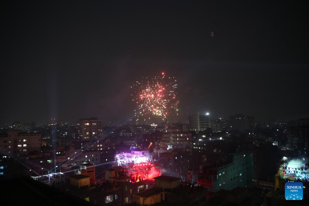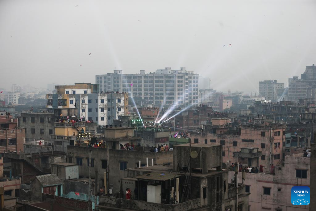 This photo taken on Jan. 14, 2026 shows coloured lights and exploding fireworks in the celebrations of the Sakrain festival in Dhaka, Bangladesh. People in Dhaka celebrated Sakrain festival, also known as Ghuri Utsob or Kite festival, at the end of Poush, the ninth month of the Bengali calendar. (Photo by Habibur Rahman/Xinhua)