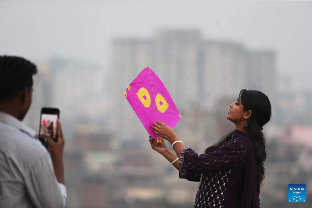 A woman holding a kite poses for a photo during the Sakrain festival in Dhaka, Bangladesh, Jan. 14, 2026. People in Dhaka celebrated Sakrain festival, also known as Ghuri Utsob or Kite festival, at the end of Poush, the ninth month of the Bengali calendar. (Photo by Habibur Rahman/Xinhua)