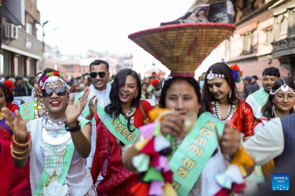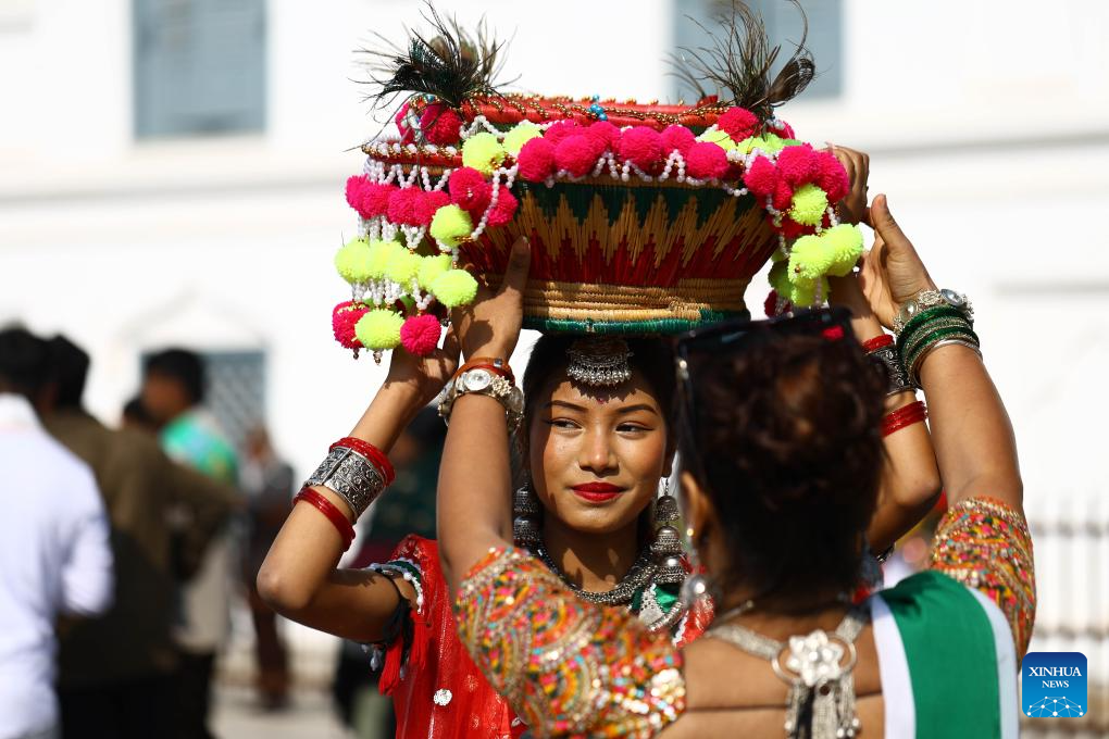 A girl prepares before taking part in a parade celebrating the Maghe Sankranti Festival in Kathmandu, Nepal, Jan. 15, 2026. Nepali Hindus celebrate the festival across the country, during which people take a ritual bath at river confluences, offer prayers at temples and enjoy traditional delicacies. (Photo by Sulav Shrestha/Xinhua)