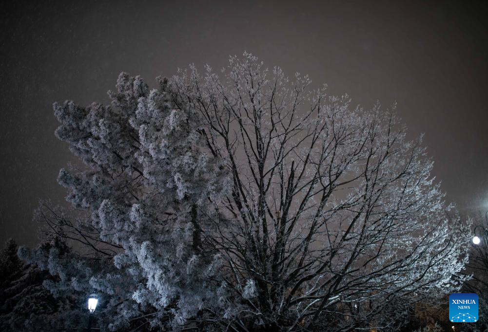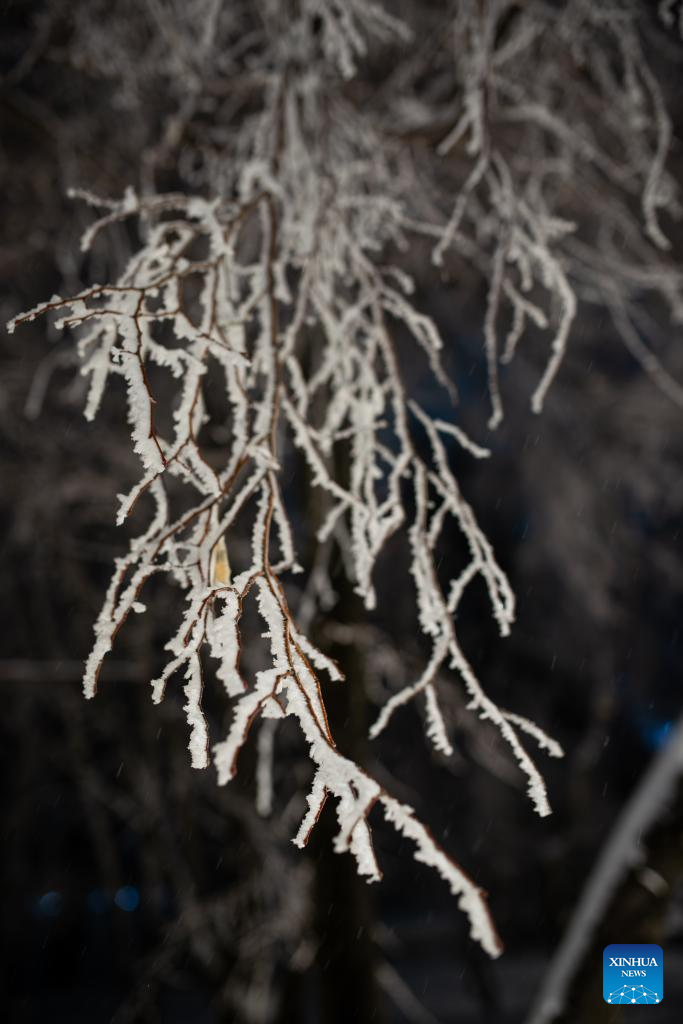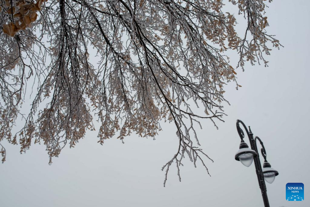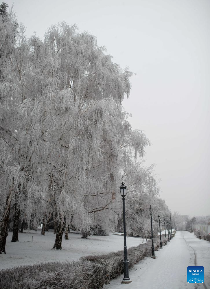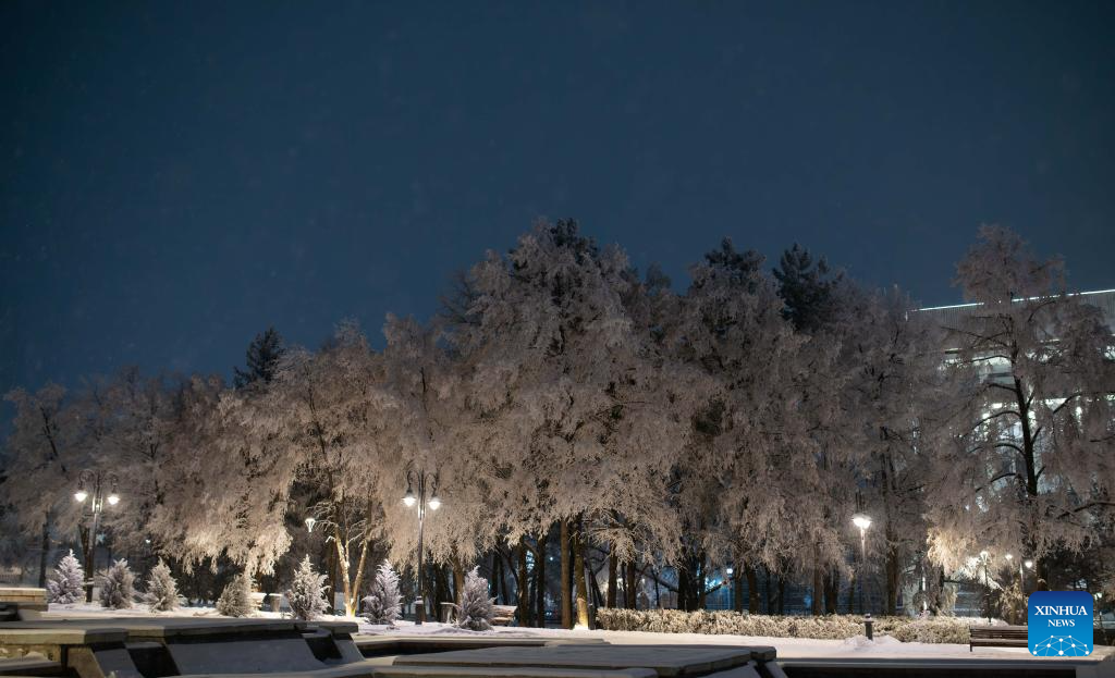Photo taken on Jan. 16, 2026 shows the rime scenery in downtown Almaty, Kazakhstan. (Xinhua/Li Renzi)