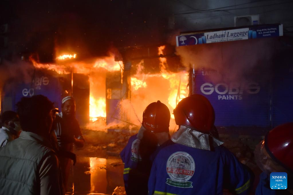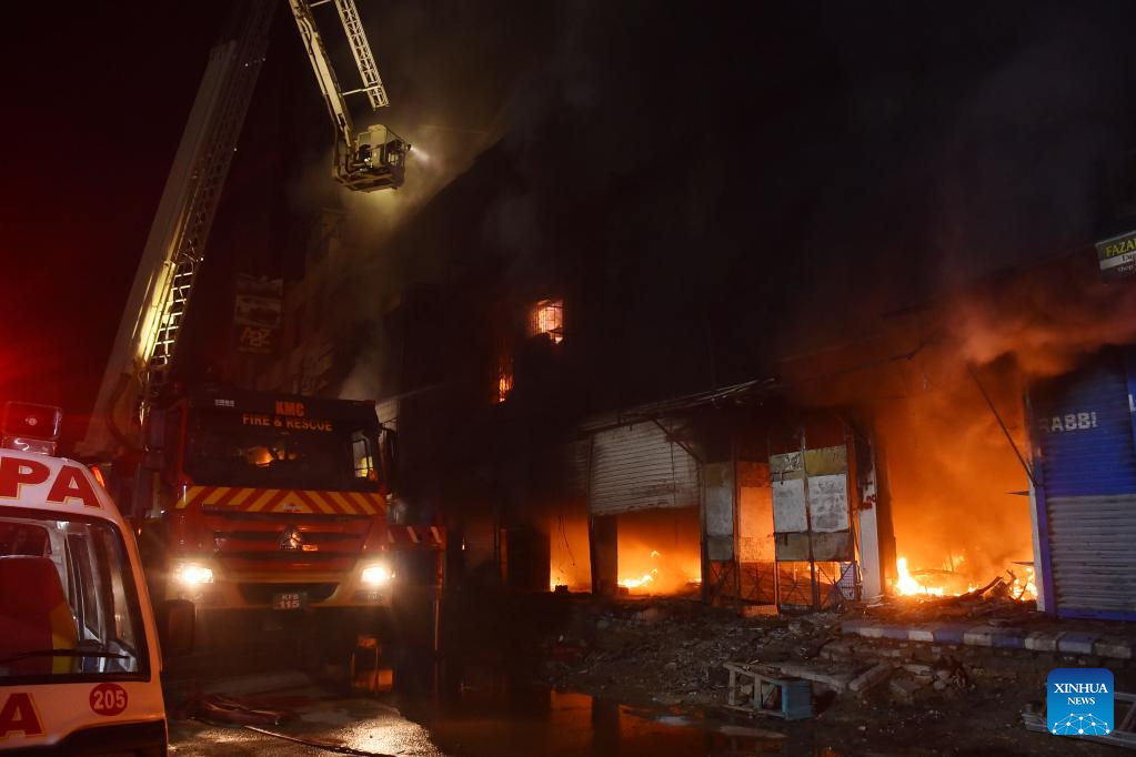 Spokesperson of the southern Sindh province, Sadia Javed, told Xinhua that the blaze erupted at Gul Plaza, a multi-storey shopping mall located on the MA Jinnah Road, which houses over 1,200 shops. (Str/Xinhua)