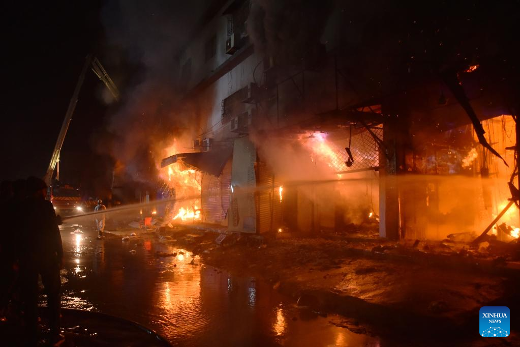 Firefighters try to extinguish a fire breaking out at a shopping mall in southern Pakistani port city of Karachi on Jan. 18, 2026. At least six people were killed and over 20 others injured after a fire broke out at a shopping mall in Pakistan's southern port city of Karachi late Saturday night, officials said on Sunday. Spokesperson of the southern Sindh province, Sadia Javed, told Xinhua that the blaze erupted at Gul Plaza, a multi-storey shopping mall located on the MA Jinnah Road, which houses over 1,200 shops. (Str/Xinhua)
