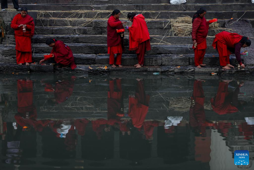 A devotee performs a ritual during the month-long Madhav Narayan Festival at Pashupatinath Temple in Kathmandu, Nepal, Jan. 18, 2026. The festival is observed through fasting and praying to Goddess Swasthani and God Madhav Narayan. (Photo by Sulav Shrestha/Xinhua)