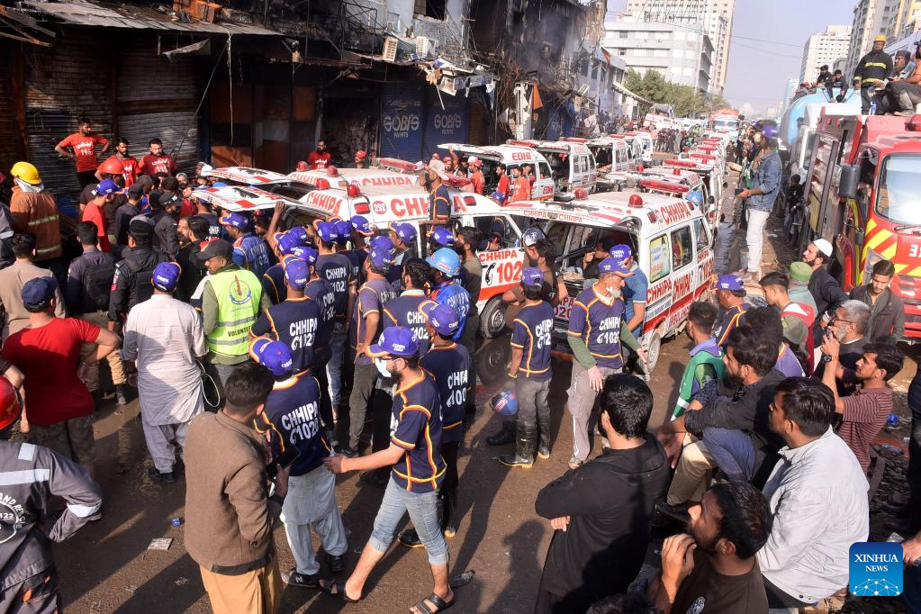 Rescuers and ambulances are seen at the fire site of a shopping mall in Karachi, Pakistan, Jan. 19, 2026. The death toll from a massive fire at a multi-story commercial building in Pakistan's southern port city of Karachi has risen to 26, while 74 people are still missing, officials said on Tuesday. (Xinhua)