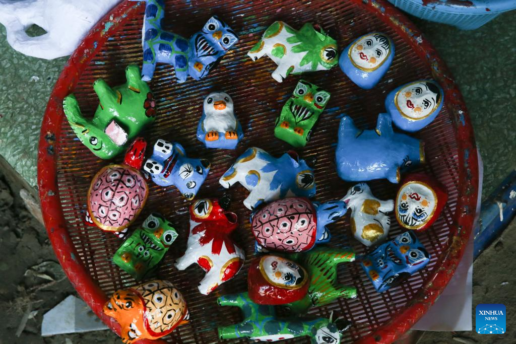 This photo taken on Jan. 21, 2026 shows handmade paper animal figures at a workshop in Yangon, Myanmar. In Yangon's Dagon Seikkan township, a small workshop named La Min Eain is alive with quiet concentration as three artisans carefully paint animal figures made entirely from paper, working steadily to meet incoming orders.(Xinhua/Myo Kyaw Soe)