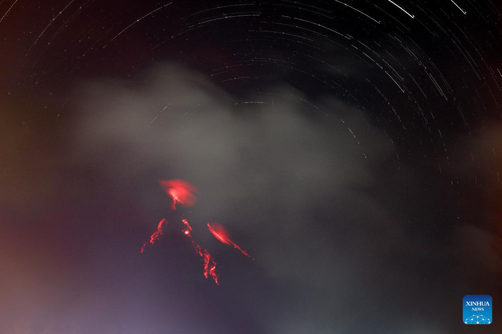 This stacked photo taken on Jan. 23, 2026 shows star trails as lava glows on the surface of Mayon Volcano in Albay Province, the Philippines. Mayon Volcano has been in a state of unrest again in recent weeks. (Xinhua/Rouelle Umali)