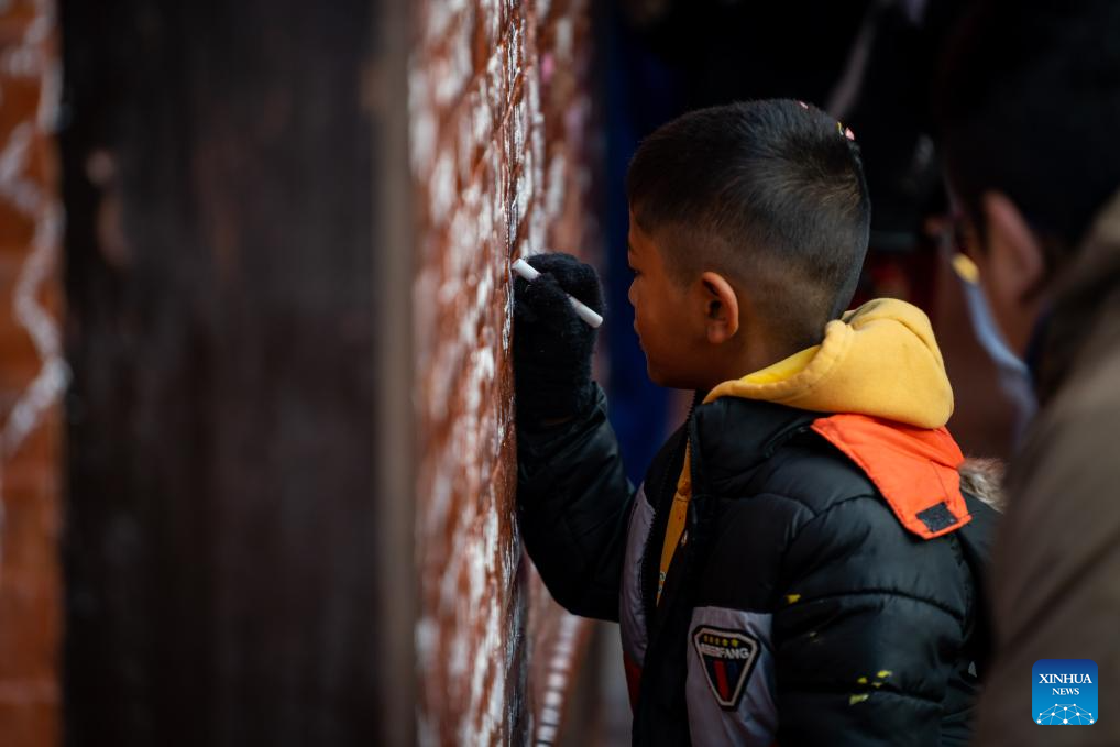 A boy writes his name on the wall of the temple of Goddess of Knowledge Saraswati in celebration of Basanta Panchami or Shree Panchami festival in Lalitpur, Nepal, Jan. 23, 2026. The festival is observed by worshipping Saraswati, the Hindu goddess of knowledge, wisdom, learning, art, music and culture. (Photo by Hari Maharjan/Xinhua)