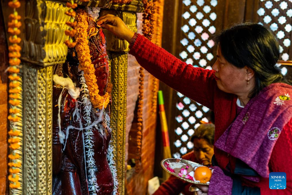 A devotee offers prayers to the Goddess of Knowledge Saraswati in celebration of Basanta Panchami or Shree Panchami festival in Lalitpur, Nepal, Jan. 23, 2026. The festival is observed by worshipping Saraswati, the Hindu goddess of knowledge, wisdom, learning, art, music and culture. (Photo by Hari Maharjan/Xinhua)