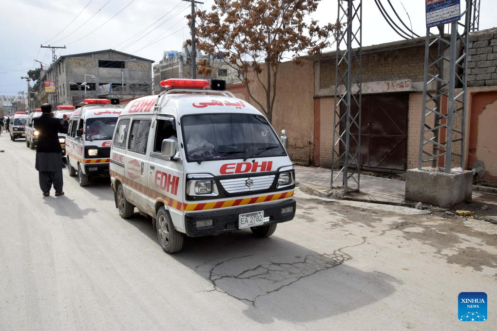 Ambulances gather near an attack site in Quetta, southwest Pakistan's Balochistan province, on Jan. 31, 2026. At least 58 terrorists, 15 troops, policemen and civilians were killed during follow-up operations launched in response to coordinated attacks in Pakistan's southwestern Balochistan province, security sources said on Saturday. (Photo by Asad/Xinhua)