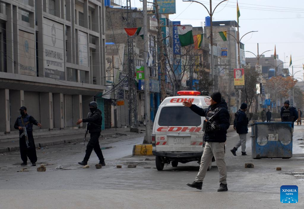 An ambulance enters an attack site in Quetta, southwest Pakistan's Balochistan province, on Jan. 31, 2026. At least 58 terrorists, 15 troops, policemen and civilians were killed during follow-up operations launched in response to coordinated attacks in Pakistan's southwestern Balochistan province, security sources said on Saturday. (Photo by Asad/Xinhua)