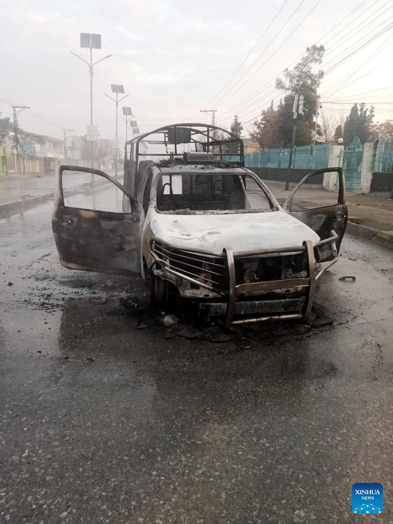 This photo taken with a mobile phone shows a burnt police vehicle following an attack in Quetta, southwest Pakistan's Balochistan province, on Jan. 31, 2026. At least 58 terrorists, 15 troops, policemen and civilians were killed during follow-up operations launched in response to coordinated attacks in Pakistan's southwestern Balochistan province, security sources said on Saturday. (Photo by Asad/Xinhua)