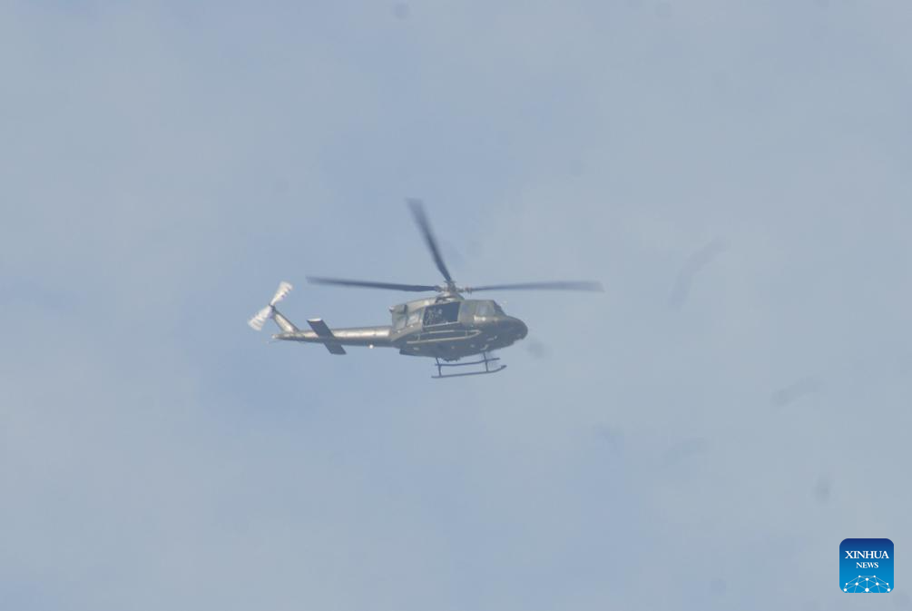 A security forces helicopter flies over an attack site in Quetta, southwest Pakistan's Balochistan province, on Jan. 31, 2026. At least 58 terrorists, 15 troops, policemen and civilians were killed during follow-up operations launched in response to coordinated attacks in Pakistan's southwestern Balochistan province, security sources said on Saturday. (Photo by Asad/Xinhua)
