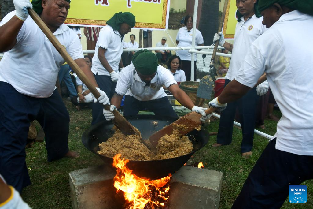 People participate in a Htamane-making competition at the Shwedagon Pagoda in Yangon, Myanmar, Jan. 31, 2026. Htamane, the festival's signature dish, is made from glutinous rice, sesame seeds, peanuts, coconut slices, and ginger. (Xinhua/Myo Kyaw Soe)