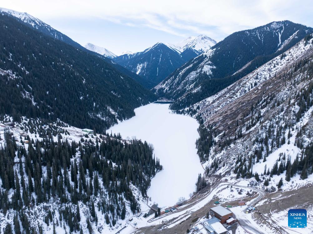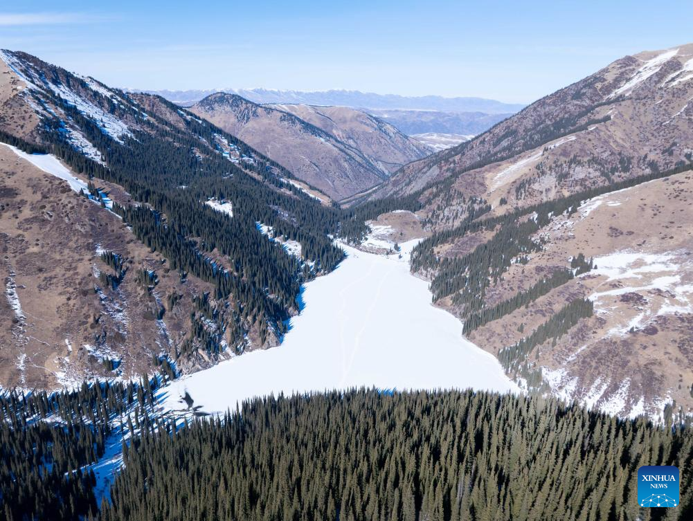This aerial drone photo taken on Feb. 1, 2026 shows a view of the Kolsai Lakes National Park in Almaty Region, Kazakhstan. (Xinhua/Li Renzi)
