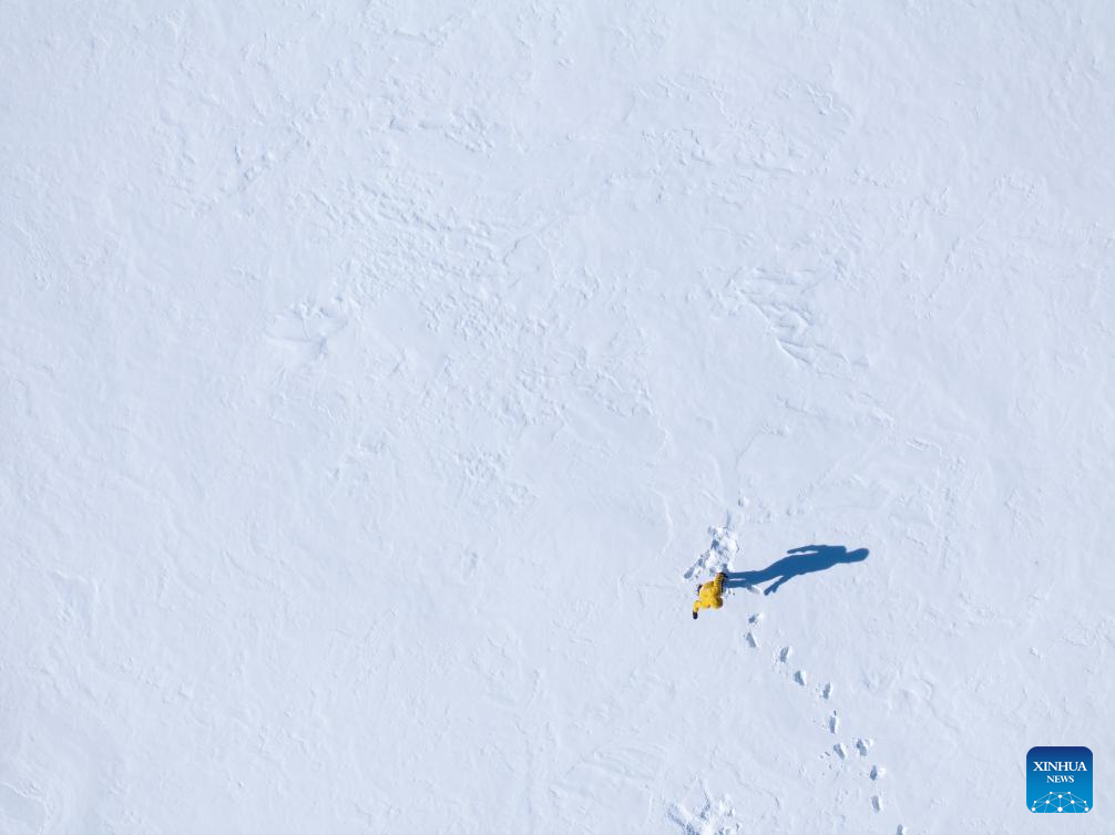 A drone photo shows a tourist visiting the Kolsai Lakes National Park in Almaty Region, Kazakhstan, Jan. 31, 2026. (Xinhua/Li Renzi)