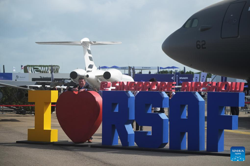 A visitor poses for photos during the 10th Singapore Airshow at Singapore's Changi Exhibition Centre on Feb. 4, 2026. (Photo by Then Chih Wey/Xinhua)