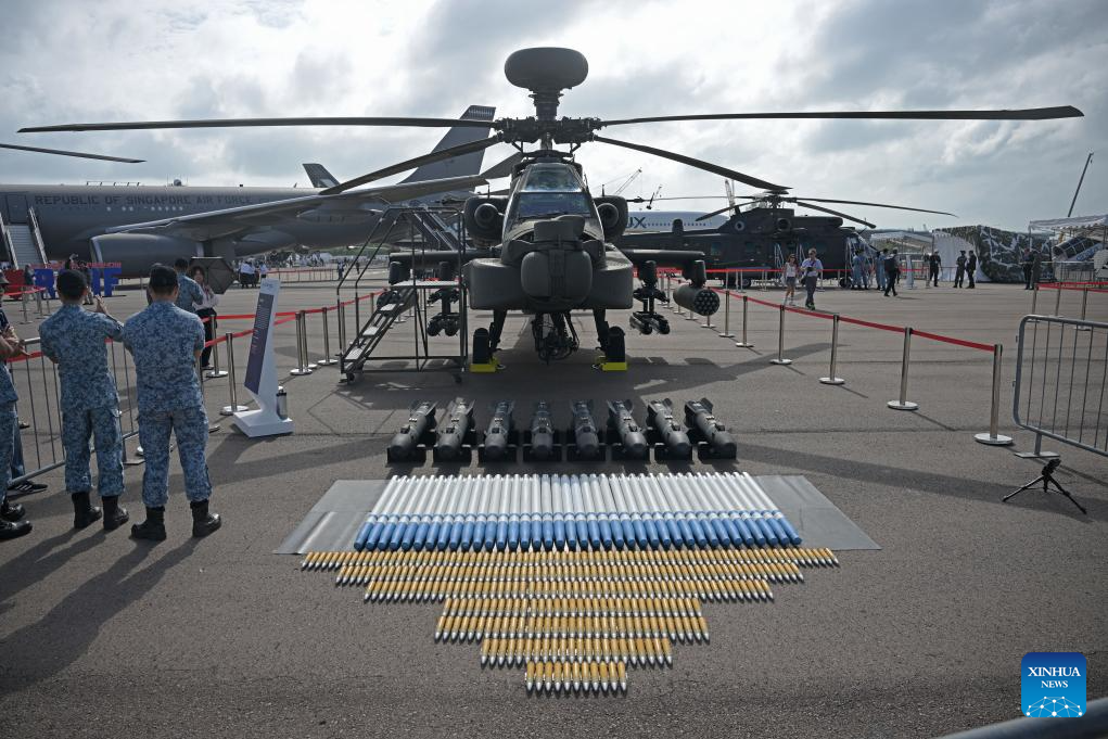 An AH-64D Apache helicopter of the Republic of Singapore Air Force is on display during the 10th Singapore Airshow at Singapore's Changi Exhibition Centre on Feb. 4, 2026. (Photo by Then Chih Wey/Xinhua)