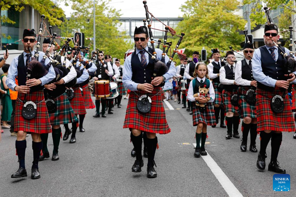 Bagpipers attend the 2026 National Multicultural Festival in Canberra, Australia, Feb. 7, 2026. The festival, held from Feb. 6 to 8 in Canberra, attracted visitors with music, dance performances and delicious food. (Photo by Chu Chen/Xinhua)