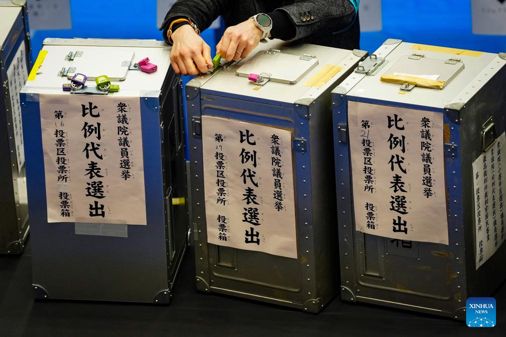 A staff member opens a ballot box at a counting station for the general election in Tokyo, Japan, Feb. 8, 2026. Japan's ruling coalition of Liberal Democratic Party (LDP) and its partner Japan Innovation Party is expected to secure a majority of seats in the House of Representatives in Sunday's general election, public broadcaster NHK said, citing its exit poll. (Xinhua/Jia Haocheng)