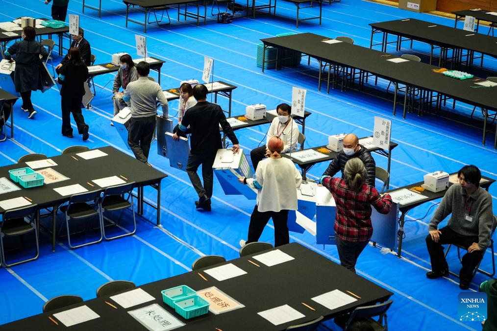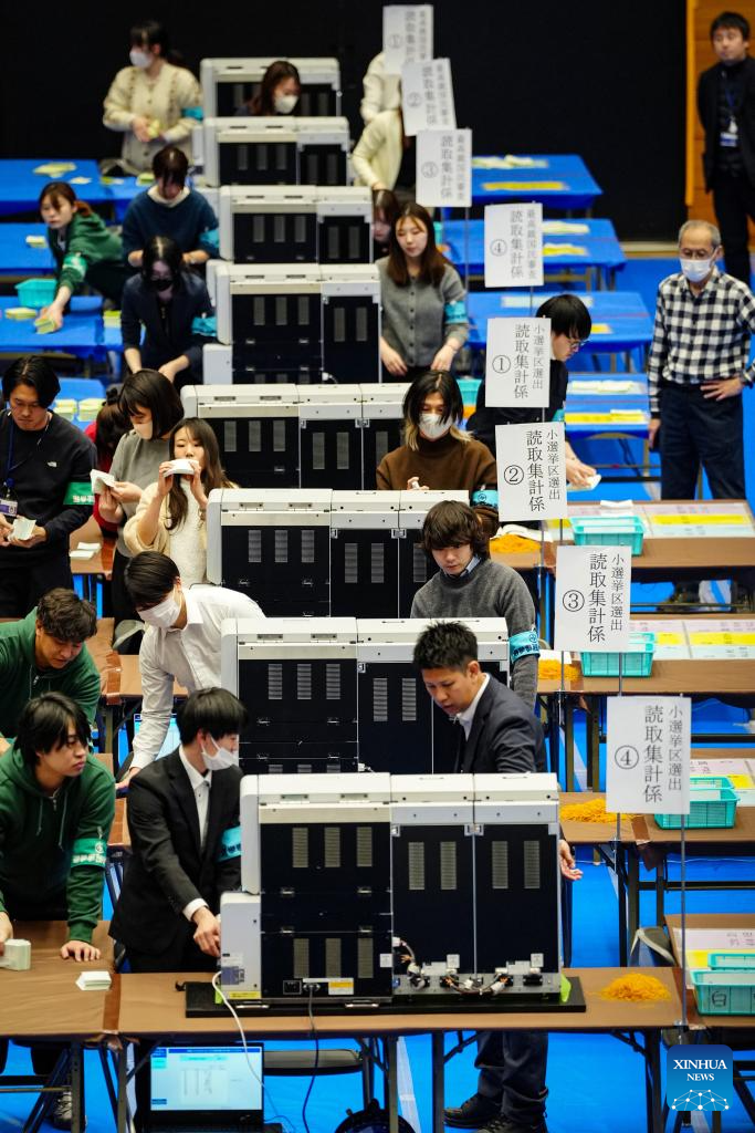 Staff members work at a counting station for the general election in Tokyo, Japan, Feb. 8, 2026. Japan's ruling coalition of Liberal Democratic Party (LDP) and its partner Japan Innovation Party is expected to secure a majority of seats in the House of Representatives in Sunday's general election, public broadcaster NHK said, citing its exit poll. (Xinhua/Jia Haocheng)