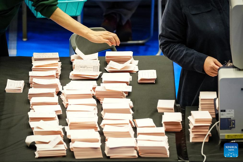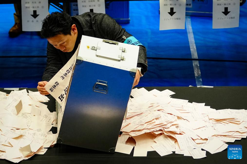 A staff member works at a counting station for the general election in Tokyo, Japan, Feb. 8, 2026. Japan's ruling coalition of Liberal Democratic Party (LDP) and its partner Japan Innovation Party is expected to secure a majority of seats in the House of Representatives in Sunday's general election, public broadcaster NHK said, citing its exit poll. (Xinhua/Jia Haocheng)