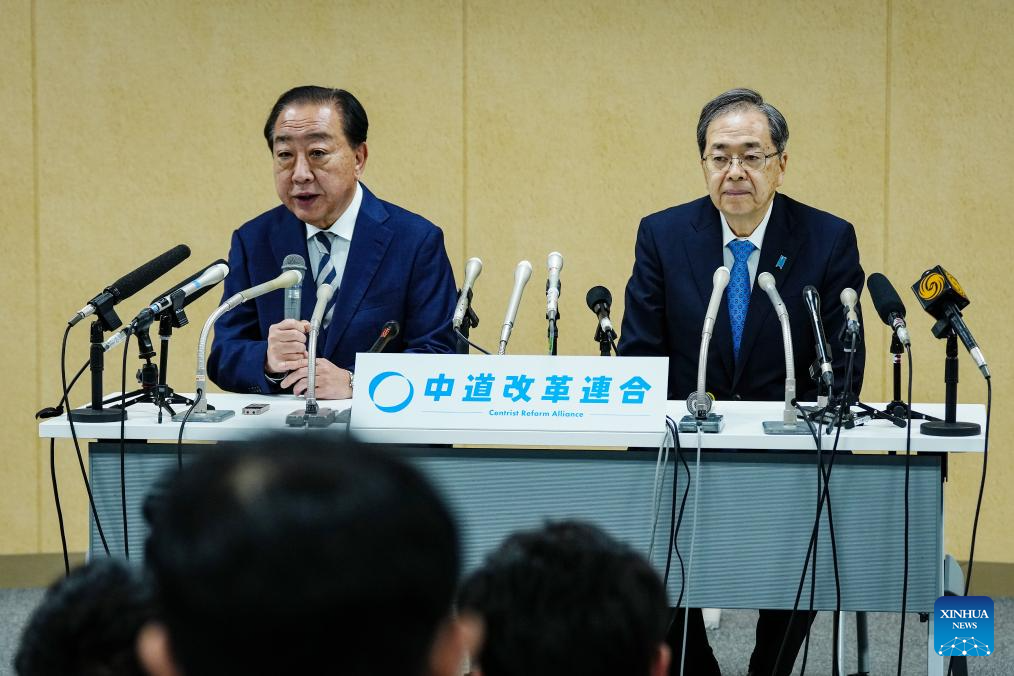Yoshihiko Noda (L) and Tetsuo Saito, co-leaders of Japan's main opposition party Centrist Reform Alliance, attend a press conference in Tokyo, Japan, Feb. 9, 2026. Yoshihiko Noda and Tetsuo Saito, co-leaders of Japan's main opposition party Centrist Reform Alliance, announced on Monday that they would resign from their posts to take responsibility for the party's defeat in the House of Representatives election. (Xinhua/Jia Haocheng)