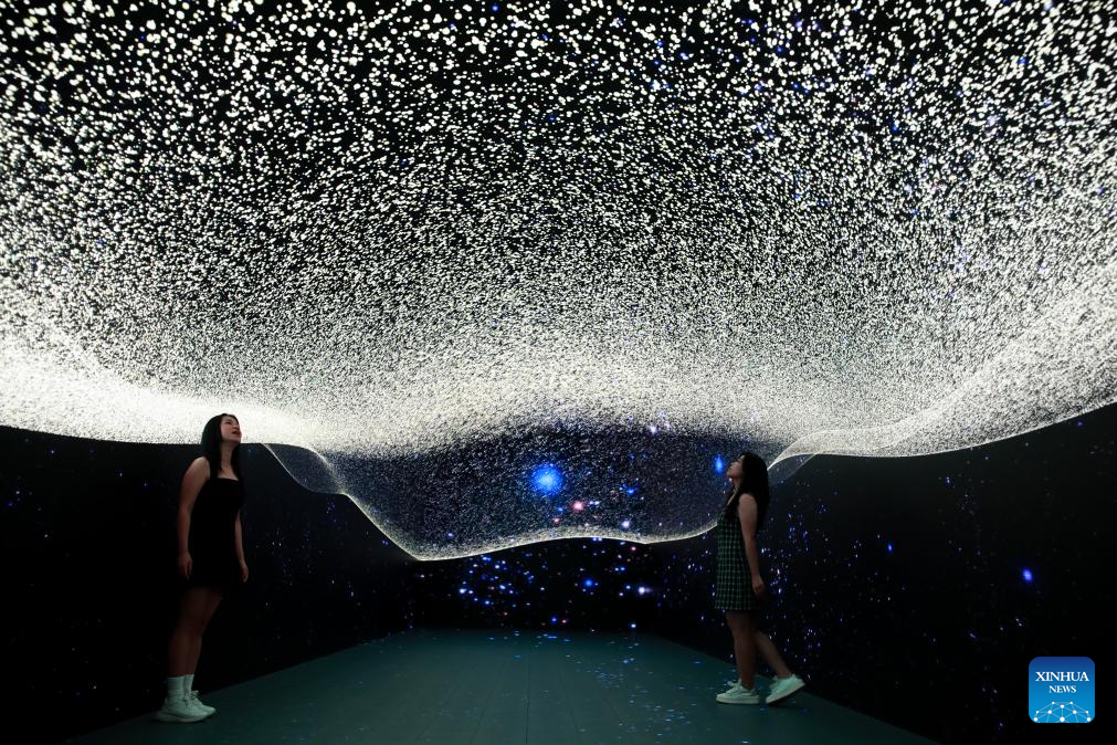 People enjoy a space-themed immersive digital experience exhibition at DigiPark Sydney in Sydney, Australia, Feb. 10, 2026. The DigiPark Sydney launched an immersive digital experience exhibition on traditional Chinese cultures, which is supported by holographic digital display technology. (Xinhua/Ma Ping)
