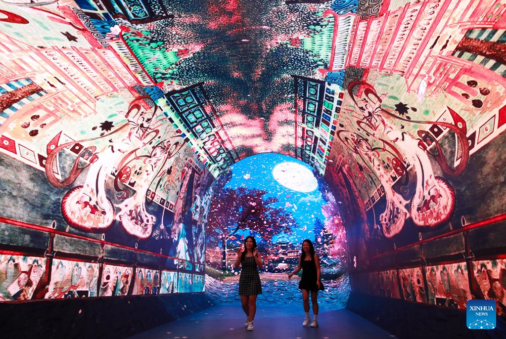 People enjoy an immersive digital experience exhibition with Chinese cultural element at DigiPark Sydney in Sydney, Australia, Feb. 10, 2026. The DigiPark Sydney launched an immersive digital experience exhibition on traditional Chinese cultures, which is supported by holographic digital display technology. (Xinhua/Ma Ping)