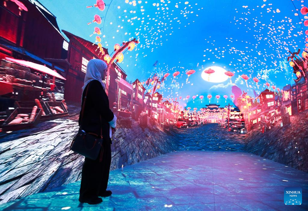 A woman enjoys an immersive digital experience exhibition with Chinese cultural element at DigiPark Sydney in Sydney, Australia, Feb. 10, 2026. The DigiPark Sydney launched an immersive digital experience exhibition on traditional Chinese cultures, which is supported by holographic digital display technology. (Xinhua/Ma Ping)