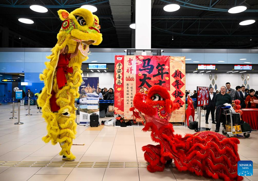 A lion dance performance is staged during a Chinese New Year cultural event at the Almaty International Airport in Almaty, Kazakhstan, Feb. 13, 2026. (Xinhua/Li Renzi)