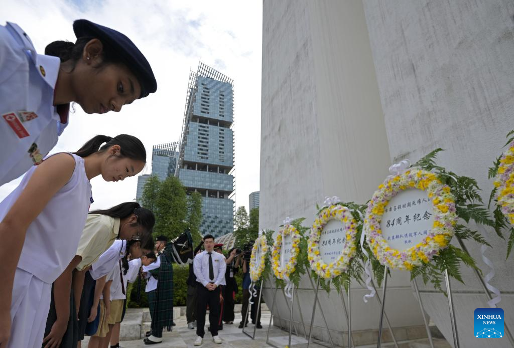 Representatives of students bow during a memorial ceremony to commemorate civilians who died during the Japanese occupation in World War II in Singapore, Feb. 15, 2026. Singapore held a memorial ceremony on Sunday to commemorate civilians who died during the Japanese occupation in World War II, with about 500 people attending the annual observance in the city center. (Photo by Then Chih Wey/Xinhua)