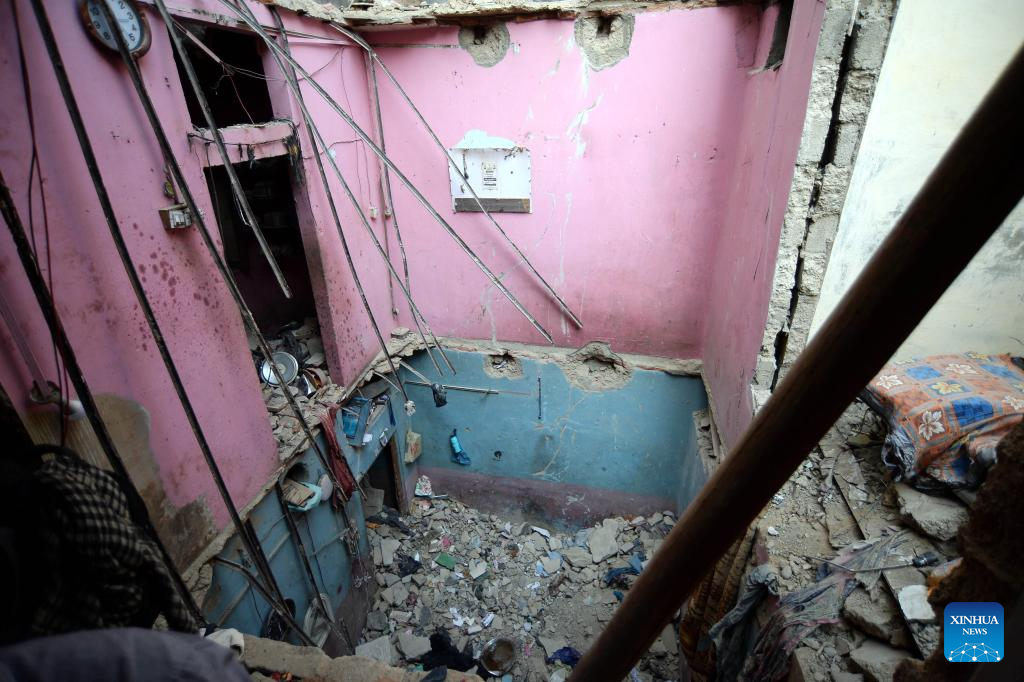 A damaged building is seen after a gas explosion in Karachi, Pakistan on Feb. 19, 2026. The death toll from a gas explosion at a residential building in Pakistan's southern port city of Karachi has risen to 16, rescue officials said on Thursday. The explosion occurred at around 4:15 a.m. local time on the first floor of a three-storey building, Assistant Superintendent of Police Jamshed Asher told media. (Xinhua)