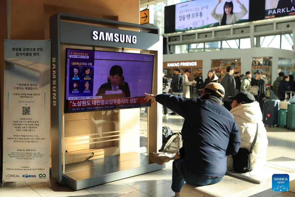 People watch a televised news report on Yoon Suk-yeol's court trial at Seoul Railway Station in Seoul, South Korea, Feb. 19, 2026. South Korea's former President Yoon Suk-yeol was sentenced to life in prison on charges of insurrection stemming from his declaration of emergency martial law, live footage showed Thursday.The Seoul Central District Court delivered its ruling, which was broadcast live to the public, saying the crux of Yoon's martial law case was the fact that troops were deployed to the National Assembly. (Photo by Park Jintaek/Xinhua)