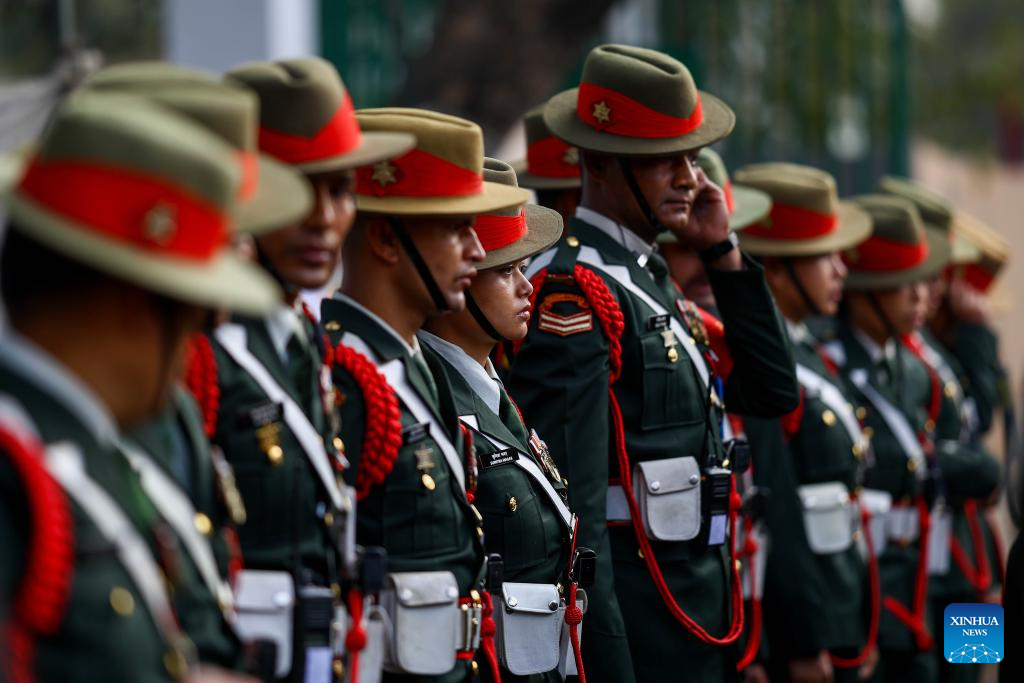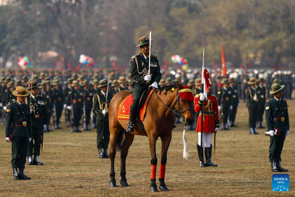 The Nepalese Army personnel take part in a ceremonial parade during the 76th National Democracy Day celebrations in Kathmandu, Nepal, Feb. 19, 2026. (Photo by Sulav Shrestha/Xinhua)