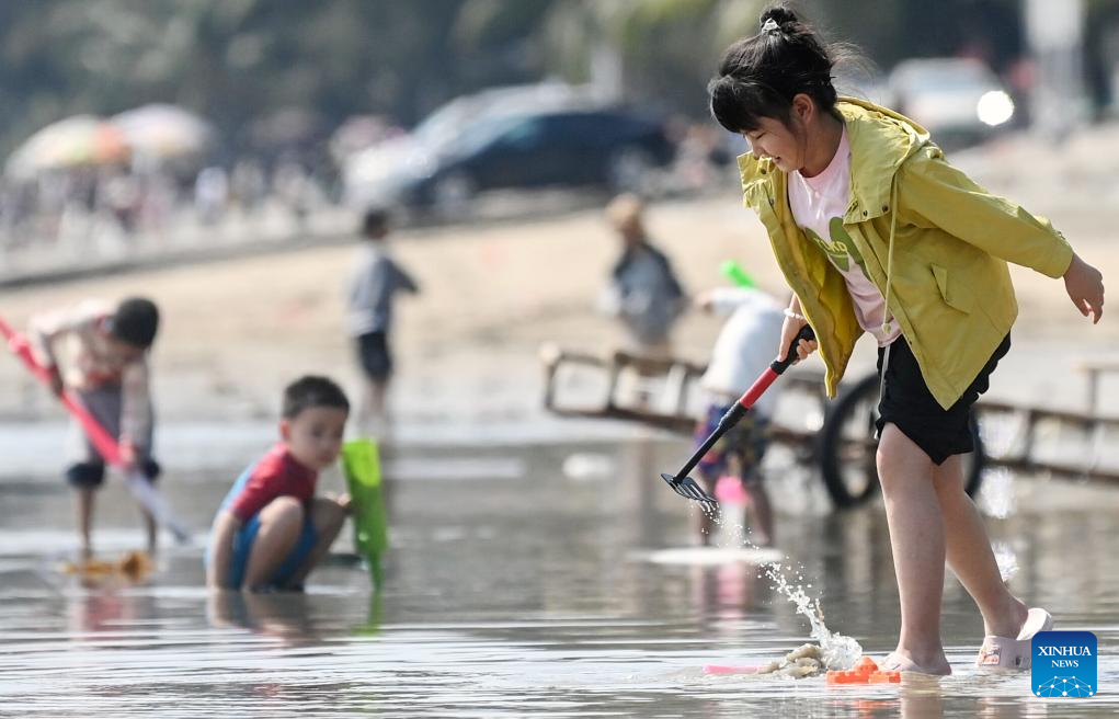Kids play on a beach in Fangchenggang, south China's Guangxi Zhuang Autonomous Region, Feb. 20, 2026. On the fourth day of the Chinese New Year, many tourists flocked into the beach here to celebrate the festival. (Xinhua/Zhang Ailin)