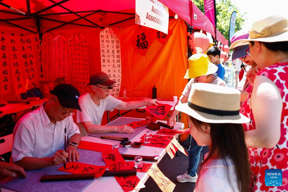 Calligraphy enthusiasts write Chinese calligraphy during an event celebrating the Spring Festival in Canberra, Australia, Feb. 21, 2026. (Photo by Chu Chen/Xinhua)