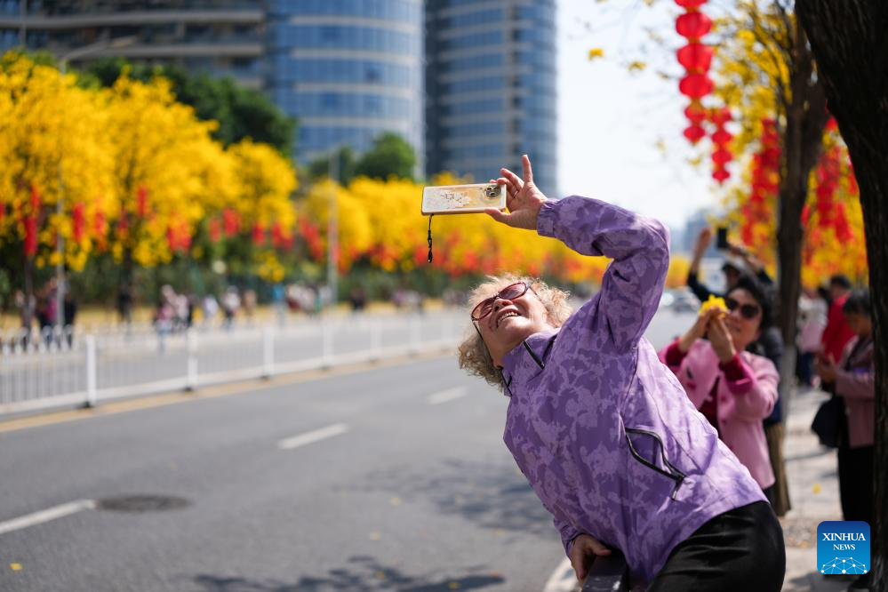 People take photos of tabebuia chrysantha blossoms in Guangzhou, south China's Guangdong Province, Feb. 20, 2026. (Xinhua/Wu Lu)