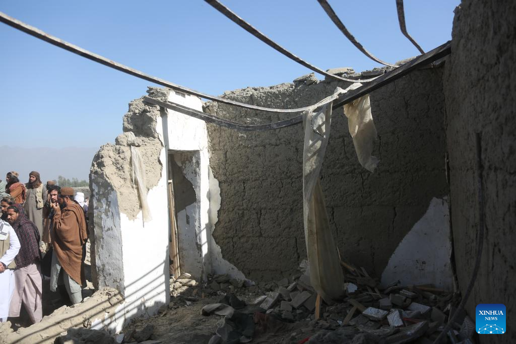 Local residents check a damaged house following an airstrike in Afghanistan's Nangarhar Province, on Feb. 22, 2026. Zabihullah Mujahid, spokesperson for the Afghan government, confirmed on X on Sunday that the Pakistani military had once again carried out airstrikes on border areas between Afghanistan and Pakistan, causing dozens of casualties. (Photo by Saifurahman Safi/Xinhua)