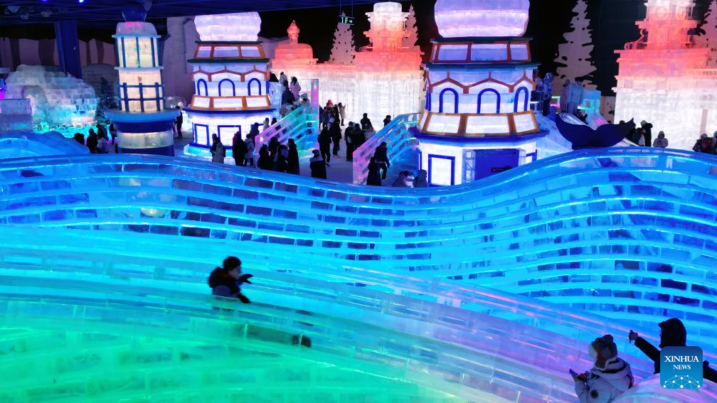Tourists have fun at the indoor ice-and-snow theme park in the Harbin Ice and Snow World in Harbin, northeast China's Heilongjiang Province, Feb. 22, 2026. The indoor ice-and-snow theme park, a facility located within Harbin Ice-Snow World, opened on Sunday as the outdoor Harbin Ice-Snow World officially closed its 27th edition on Saturday. (Photo by Liu Yang/Xinhua)