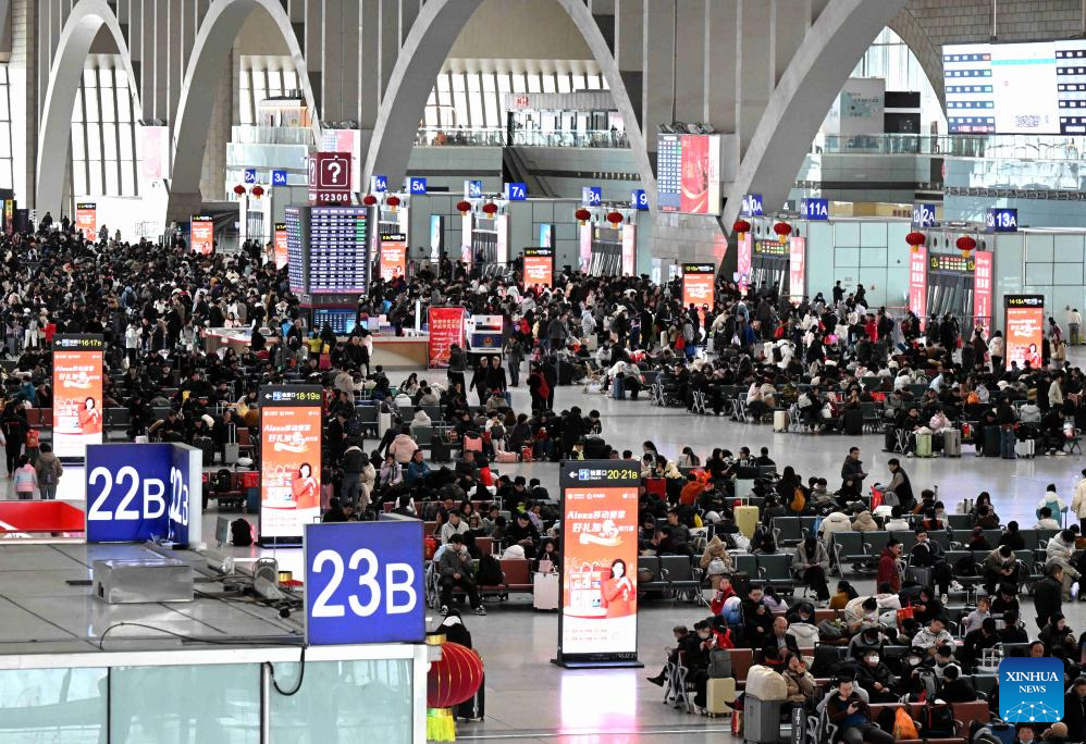 Passengers wait for trains at the waiting hall of Shijiazhuang Railway Station in Shijiazhuang, north China's Hebei Province, on Feb. 23, 2026. China's national railway operator said on Monday that Feb. 23, the last day of a nine-day Spring Festival holiday, will most likely see the highest peak in passenger return journeys, forecasting that up to 18.5 million trips will be made via the railway system on this day.