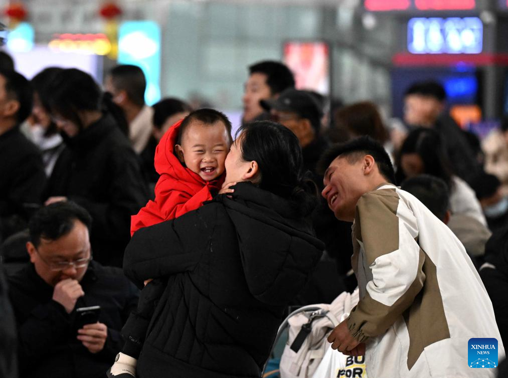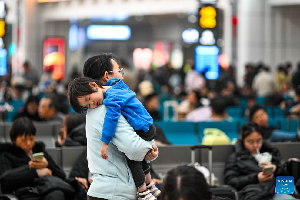 A boy and his family are pictured at the waiting hall of Shijiazhuang Railway Station in Shijiazhuang, north China's Hebei Province, on Feb. 23, 2026. China's national railway operator said on Monday that Feb. 23, the last day of a nine-day Spring Festival holiday, will most likely see the highest peak in passenger return journeys, forecasting that up to 18.5 million trips will be made via the railway system on this day.