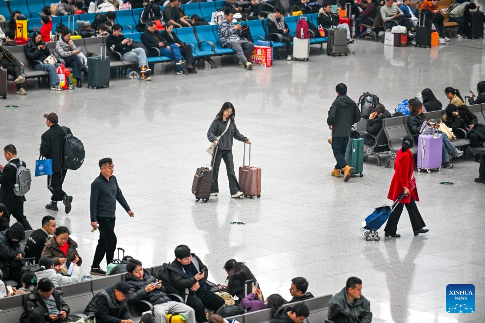 Passengers are pictured at the waiting hall of Chongqing North Railway Station in Chongqing, southwest China, on Feb. 23, 2026. China's national railway operator said on Monday that Feb. 23, the last day of a nine-day Spring Festival holiday, will most likely see the highest peak in passenger return journeys, forecasting that up to 18.5 million trips will be made via the railway system on this day.