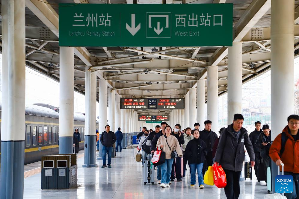 Passengers walk on the platform of Lanzhou Railway Station in Lanzhou, northwest China's Gansu Province, on Feb. 23, 2026. China's national railway operator said on Monday that Feb. 23, the last day of a nine-day Spring Festival holiday, will most likely see the highest peak in passenger return journeys, forecasting that up to 18.5 million trips will be made via the railway system on this day.