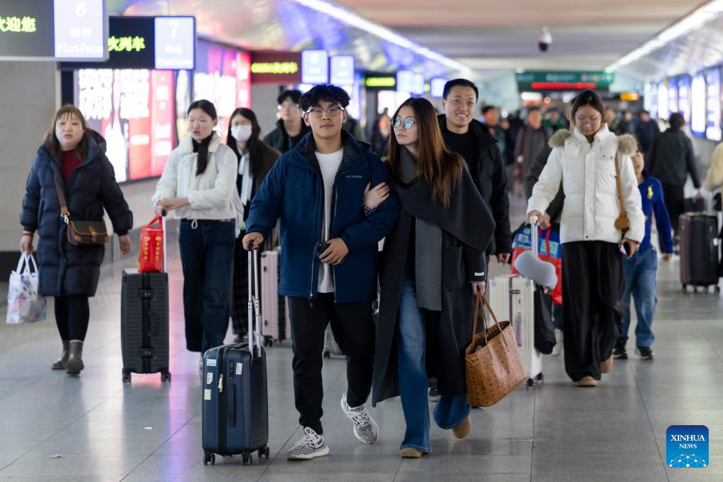 Passengers head to board trains at Wuhan Railway Station in Wuhan, central China's Hubei Province, on Feb. 23, 2026. China's national railway operator said on Monday that Feb. 23, the last day of a nine-day Spring Festival holiday, will most likely see the highest peak in passenger return journeys, forecasting that up to 18.5 million trips will be made via the railway system on this day.