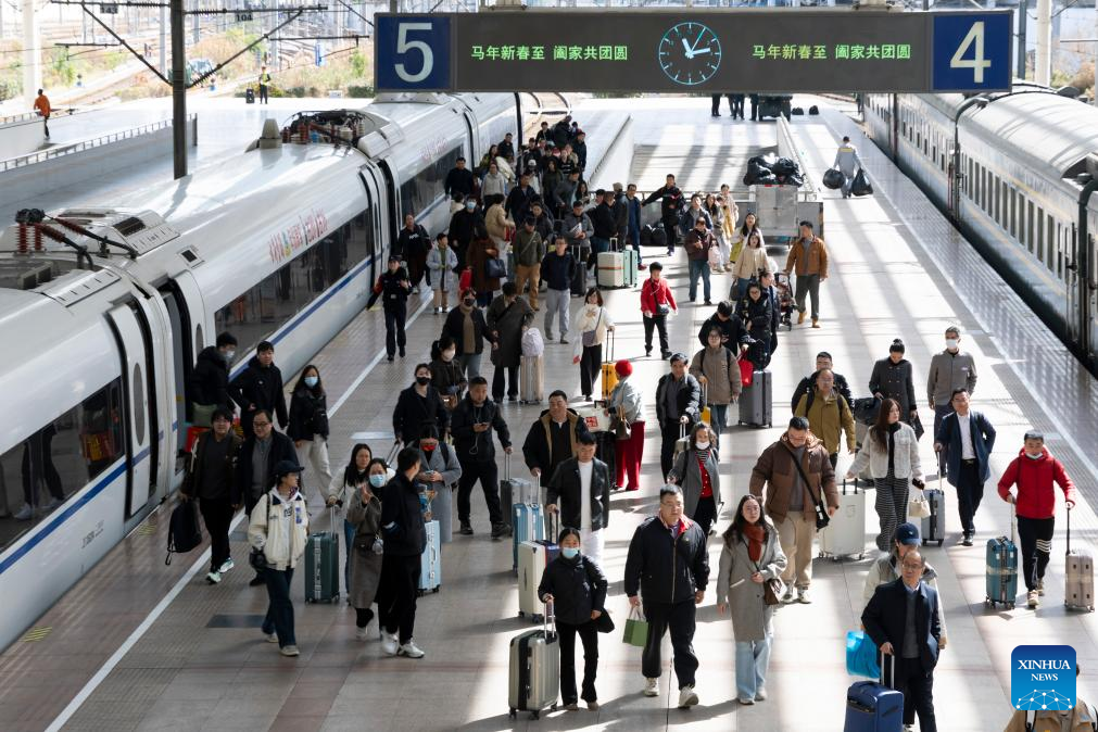 China State Railway Group Co., Ltd. said that the expected trips on Monday will follow the nearly 18.3 million passenger journeys made on the previous day. An additional 2,297 trains will be operated on Monday to cater to the huge travel demand, it added. (Photo by Ren Fei/Xinhua)