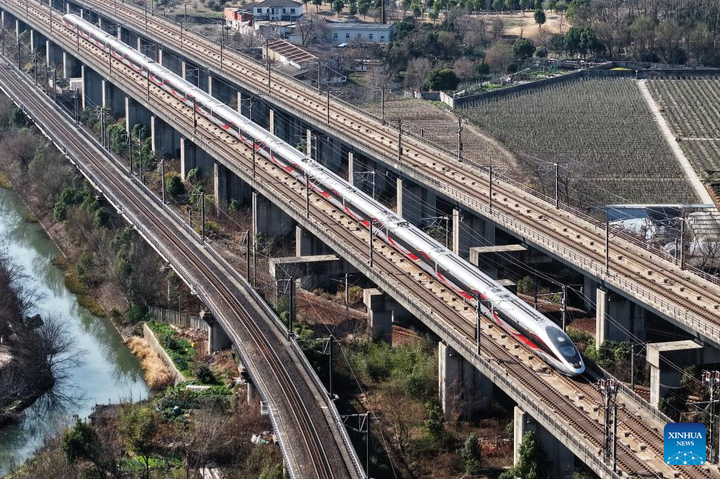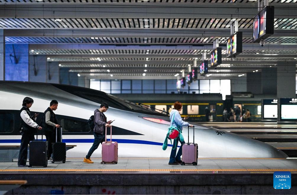 Passengers head to board trains at Tongren South Railway Station along the Shanghai-Kunming high-speed railway in Tongren City, southwest China's Guizhou Province, on Feb. 23, 2026. China's national railway operator said on Monday that Feb. 23, the last day of a nine-day Spring Festival holiday, will most likely see the highest peak in passenger return journeys, forecasting that up to 18.5 million trips will be made via the railway system on this day.
