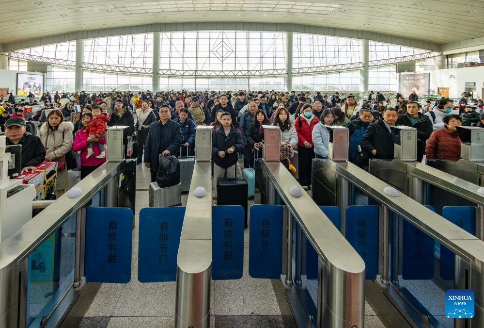 China State Railway Group Co., Ltd. said that the expected trips on Monday will follow the nearly 18.3 million passenger journeys made on the previous day. An additional 2,297 trains will be operated on Monday to cater to the huge travel demand, it added. (Photo by Hu Panxue/Xinhua)