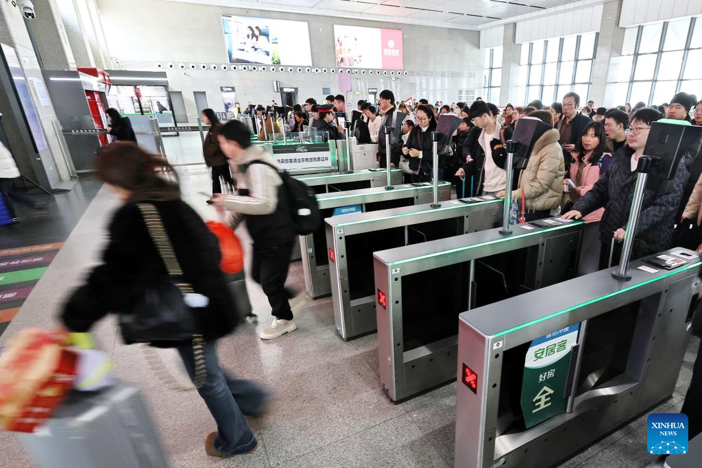 Passengers queue up to check in at Jiaxing South Railway Station in Jiaxing, east China's Zhejiang Province, on Feb. 23, 2026. China's national railway operator said on Monday that Feb. 23, the last day of a nine-day Spring Festival holiday, will most likely see the highest peak in passenger return journeys, forecasting that up to 18.5 million trips will be made via the railway system on this day.