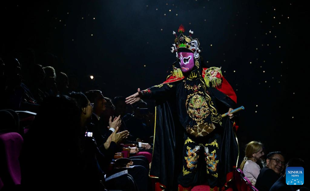 An artist interacts with the audience during a face-changing performance at a "Happy Chinese New Year" celebration event in Ashgabat, Turkmenistan, Feb. 23, 2026. (Chinese Embassy in Turkmenistan/Handout via Xinhua)